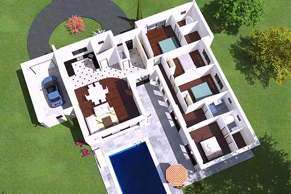 L’agencement en U permet de séparer intelligemment les espaces de vie et les espaces nuit, garantissant calme et tranquillité. Au centre, la terrasse devient un lieu privilégié pour se détendre, avec un coin repas extérieur et une vue directe sur la piscine, créant une atmosphère de vacances toute l’année.